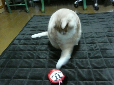 | まあ少し運動でもと出てきたのは、カミサンの職場の方のおみや、ダルマミッキーとか・・・??? | ・・・ま、我家にくればネコのオモチャさ・・・って、ゴメンナサイ。 でも、珍しく反応しましたネエ・・・。 |